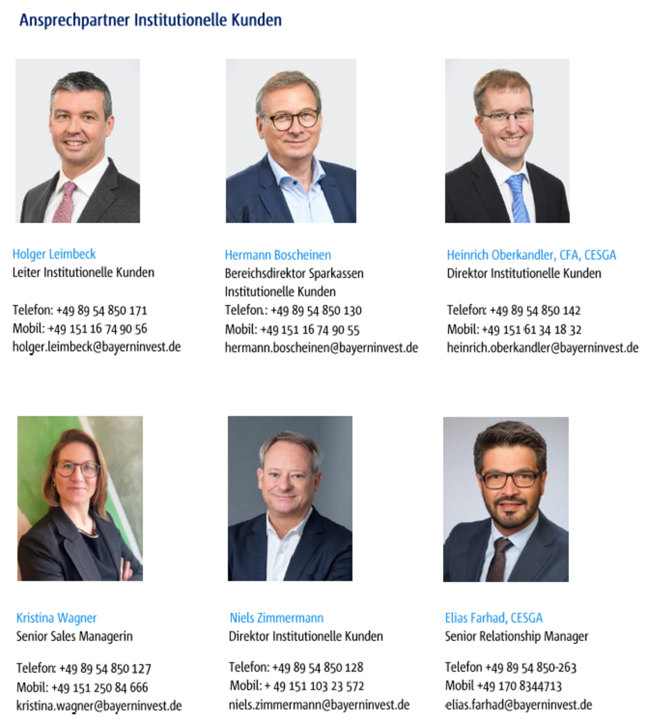 Dies ist eine Marketinganzeige. Bitte lesen Sie den Verkaufsprospekt, bevor Sie eine endgültige Anlageentscheidung treffen. Diese Unterlage wurde auf Grundlage von nach Ansicht der BayernInvest Kapitalverwaltungsgesellschaft mbh und der BayernInvest Luxembourg S.A. (beide BI) als zuverlässig und genau geltenden Quellen erstellt, ohne dass die BI eine Gewähr für Vollständigkeit und Richtigkeit dieser Quellen übernimmt. Aus der in dieser Präsentation gemachten Angaben kann keine verbindliche Aussage über künftige Wertentwicklungen gemacht werden. Die Unterlage wurde von der BI nach bestem Wissen und Gewissen erstellt, ohne dass eine Gewähr für Vollständigkeit und Richtigkeit übernommen wird. Sie soll lediglich als allgemeine Information dienen und gibt das Meinungsbild der BI wieder. Die geäußerten Ansichten können je nach Markt- und anderen Bedingungen jederzeit Veränderungen unterliegen. Die BI übernimmt keine Gewähr dafür, dass sich Länder, Märkte oder Branchen wie erwartet entwickeln. Investitionen enthalten Risiken, bspw. politische und währungsbedingte Risiken. Die Rendite und der Wert der zugrunde liegenden Anlagen können sinken oder steigen und können zu einem vollständigen Verlust des eingesetzten Kapitals führen. Die BayernInvest haftet nicht für den Eintritt einer bestimmten Performance der Anlage. Soweit die Präsentation eine Angabe einer Performance eines von der BI verwalteten Fonds enthält, ist die Performance nach BVI-Methode berechnet. Bei Bruttoperformance werden die auf Fondsebene anfallenden Kosten (z.B. Verwaltungsvergütung, Prüfungskosten, Trading Kosten etc.) nicht, bei Nettoperformance werden die auf Fondsebene anfallenden Kosten berücksichtigt. Die auf Kundenebene anfallenden Kosten (Ausgabeaufschlag, Depotkosten etc.) sind in der angegebenen Performance nicht berücksichtigt. Bei einer Anlage in Publikumsinvestmentvermögen sind die im Verkaufsprospekt beschriebenen Regelungen maßgeblich. Die Haftung der BI beschränkt sich auf Vorsatz und grobe Fahrlässigkeit. Im Falle der Verletzung von Kardinalpflichten haftet die BI auch für einfache Fahrlässigkeit. In diesen Fällen ist die Haftung jedoch auf den typischen und vorhersehbaren Schaden beschränkt. Die Haftungsbeschränkung gilt neben dem Empfänger dieses Dokuments auch gegenüber Dritten, die dieses Dokument möglicherweise prüfen oder Informationen hieraus verwenden. Die Beschränkung der Haftung bezieht sich auf sämtliche Verluste sowie unmittelbare Schäden und Folgeschäden. Die Präsentation beinhaltet weder eine persönliche anleger- und objektgerechte, bzw. steuerliche oder rechtliche Beratung. Diese Präsentation richtet sich an „Professionelle Kunden“ und „Geeignete Gegenparteien“, nicht aber an „Privatkunden“ im Sinne des § 67 WpHG. Es wird darauf hingewiesen, dass diese Präsentation infolgedessen nicht die Vorgaben der BaFin im Hinblick auf Informationen durch Kapitalverwaltungs- und Wertpapierhandelsgesellschaften gegenüber Privatkunden erfüllt.