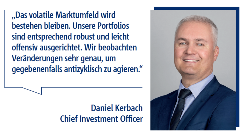 Das volatile Marktumfeld wird bestehen bleiben. Unsere Portfolios sind entsprechend robust und leicht offensiv ausgerichtet. Somit tragen wir dem aktuellen Umfeld bestmöglich Rechnung. Für das Jahr 2023 empfehlen wir eine leicht offensive Risikostruktur in den Portfolios, um eine Balance zwischen Risiko und Chance zu gewährleisten. Wir sind risikobewusst investiert und beobachten die Veränderungen sehr genau, um gegebenenfalls antizyklisch zu agieren.
