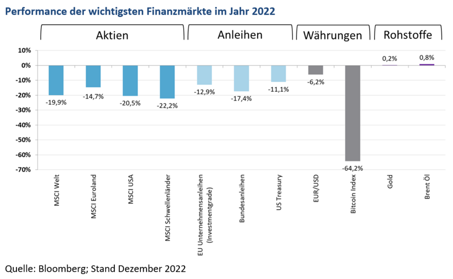 Das Jahr 2022 konnte bewegter kaum sein. Für Kapitalanleger war es ein Jahr zum Vergessen, so korrigierten Aktien- und Rentenmärkte gleichermaßen und beendeten das Jahr mit weitgehend zweistelligen Performanceverlusten. In Summe ging ein Jahr zu Ende, in welchem die Inflation steil Anstieg, das Wachstum sich stark abschwächte, die Zinsen massiv anzuziehen begannen und die Kapitalmärkte an breiter Front litten.