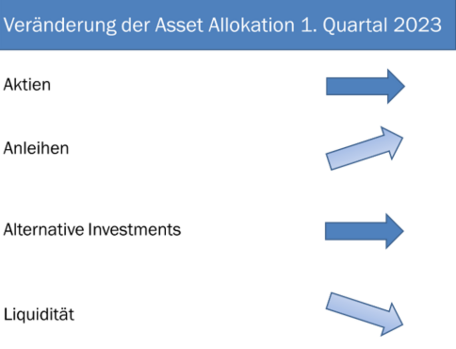 Für den weiteren Verlauf des Jahres 2023 empfehlen wir eine vorerst neutrale Risikoausrichtung in der Portfolio-Allokation. Wir haben demensprechend die Kassaquote zugunsten von Anleihen untergewichtet und im Gegenzug Anleihen neu auf „Übergewichten“ hochgestuft mit einer vorerst neutralen Durations-Empfehlung.