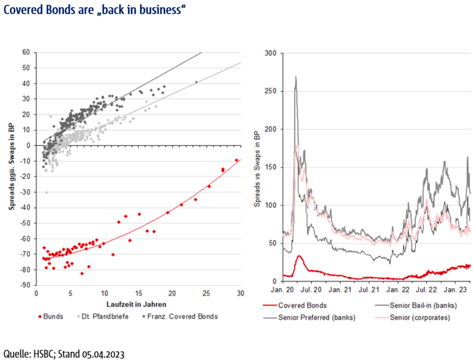 - Für Covered Bonds spricht aber auch die geringere Spread-Volatilität. Insbesondere in Risk-off-Phasen, wie erst wieder kürzlich durch die Insolvenz der Silicon Valley Bank ausgelöst, halten sich Covered Bonds gegenüber anderen Rentensegmenten aufgrund ihrer besonderen Ausstattungsmerkmale besonders stabil (siehe rechte Grafik unten).