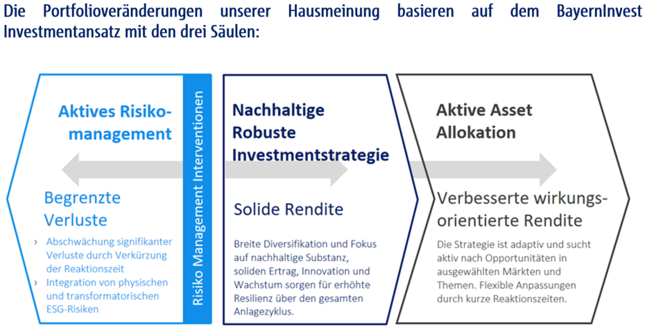 Veränderungen an den Kapitalmärkten werden situativ und fortlaufend im BayernInvest Investmentansatz berücksichtigt. Im Kern unseres Ansatzes streben wir eine solide Rendite basierend auf dem Fokus auf nachhaltigen robusten Substanzanlagen an.