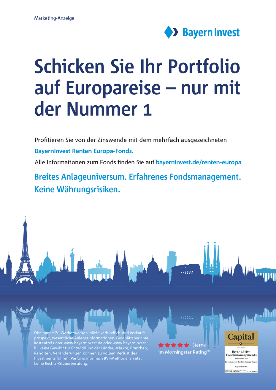 Mit dem aktiv gemanagten BayernInvest Renten Europa-Fonds erzielen unsere Portfoliomanager, Gerd Rendenbach und Hakem Saidi-Merella, seit Jahren überdurchschnittliche Renditen. Und das nicht erst seit der Zinswende, sondern in verschiedensten Marktphasen – wie kontinuierliche 5 Sterne bei Morningstar, das Capital-Rating „Beste aktive Fondsmanagements“ im Bereich Anleihen Euro oder der renommierte Refinitiv Lipper Fund Award 2023 belegen.