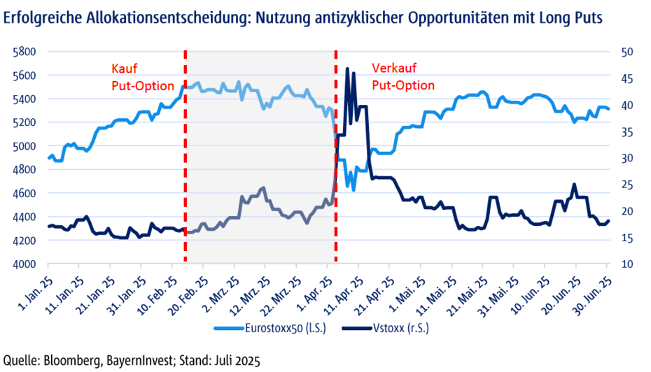 Besonders hervorzuheben sind die zwei Schlüsselereignisse des ersten Halbjahres. Zum einen der „Liberation Day“ in den USA und der „12-Tages Krieg“ im Iran. Rund um den sogenannten „Liberation Day“ von Donald Trump haben wir proaktiv gehandelt: Bereits Mitte Februar 2025 haben wir über den gezielten Kauf von Put-Optionen unsere Portfolios gegen drohende Marktkorrekturen abgesichert. Zeitgleich haben wir europäische Staatsanleihen auf Übergewichten gesetzt. Die Volatilität war zu diesem Zeitpunkt niedrig – ein ideales Umfeld für die günstige Positionierung. Als sich die erwartete Korrektur realisierte und die Volatilität stark anzog, konnten wir die Absicherungspositionen im April mit Gewinn schließen. Gleichzeitig nutzten wir das günstige Bewertungsniveau, um die Aktienquote taktisch wieder zu erhöhen. So gelang es uns, in einer angespannten Marktphase Verluste zu vermeiden und gleichzeitig antizyklische Chancen für unsere Kunden zu nutzen.