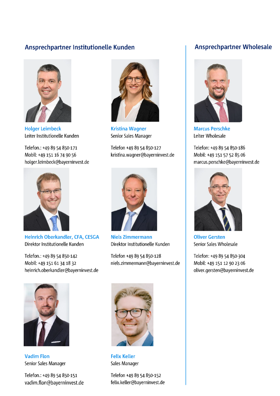 Diese Unterlage wurde auf Grundlage von nach Ansicht der BayernInvest Kapitalverwaltungsgesellschaft (BI) als zuverlässig und genau geltenden Quellen erstellt, ohne dass die BI eine Gewähr für Vollständigkeit und Richtigkeit dieser Quellen übernimmt. Aus der in dieser Präsentation gemachten Angaben kann keine verbindliche Aussage über künftige Wertentwicklungen gemacht werden. Die Unterlage wurde von der BI nach bestem Wissen und Gewissen erstellt, ohne dass eine Gewähr für Vollständigkeit und Richtigkeit übernommen wird. Sie soll lediglich als allgemeine Information dienen und gibt das Meinungsbild der BI wieder. Die geäußerten Ansichten können je nach Markt- und anderen Bedingungen jederzeit Veränderungen unterliegen. Die BI übernimmt keine Gewähr dafür, dass sich Länder, Märkte oder Branchen wie erwartet entwickeln. Investitionen enthalten Risiken, bspw. politische und währungsbedingte Risiken. Die Rendite und der Wert der zugrunde liegenden Anlagen können sinken oder steigen und können zu einem vollständigen Verlust des eingesetzten Kapitals führen. Die BayernInvest haftet nicht für den Eintritt einer bestimmten Performance der Anlage. Soweit die Präsentation eine Angabe einer Performance eines von der BI verwalteten Fonds enthält, ist die Performance nach BVI-Methode berechnet. Bei Bruttoperformance werden die auf Fondsebene anfallenden Kosten (z.B. Verwaltungsvergütung, Prüfungskosten, Trading Kosten etc.) nicht, bei Nettoperformance werden die auf Fondsebene anfallenden Kosten berücksichtigt. Die auf Kundenebene anfallenden Kosten (Ausgabeaufschlag, Depotkosten etc.) sind in der angegebenen Performance nicht berücksichtigt. Bei einer Anlage in Publikumsinvestmentvermögen sind die im Verkaufsprospekt beschriebenen Regelungen maßgeblich. Die Haftung der BI beschränkt sich auf Vorsatz und grobe Fahrlässigkeit. Im Falle der Verletzung von Kardinalpflichten haftet die BayernInvest auch für einfache Fahrlässigkeit. In diesen Fällen ist die Haftung jedoch auf den typischen und vorhersehbaren Schaden beschränkt. Die Haftungsbeschränkung gilt neben dem Empfänger dieses Dokuments auch gegenüber Dritten, die dieses Dokument möglicherweise prüfen oder Informationen hieraus verwenden. Die Beschränkung der Haftung bezieht sich auf sämtliche Verluste sowie unmittelbare Schäden und Folgeschäden. Die Präsentation beinhaltet weder eine persönliche anleger- und objektgerechte, bzw. steuerliche oder rechtliche Beratung. Diese Präsentation richtet sich an „Professionelle Kunden“ und „Geeignete Gegenparteien“, nicht aber an „Privatkunden“ im Sinne des § 67 WpHG. Es wird darauf hingewiesen, dass diese Präsentation infolgedessen nicht die Vorgaben der BaFin im Hinblick auf Informationen durch Kapitalverwaltungs- und Wertpapierhandelsgesellschaften gegenüber Privatkunden erfüllt.