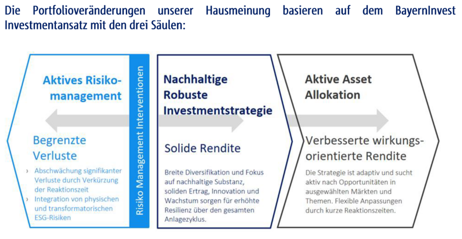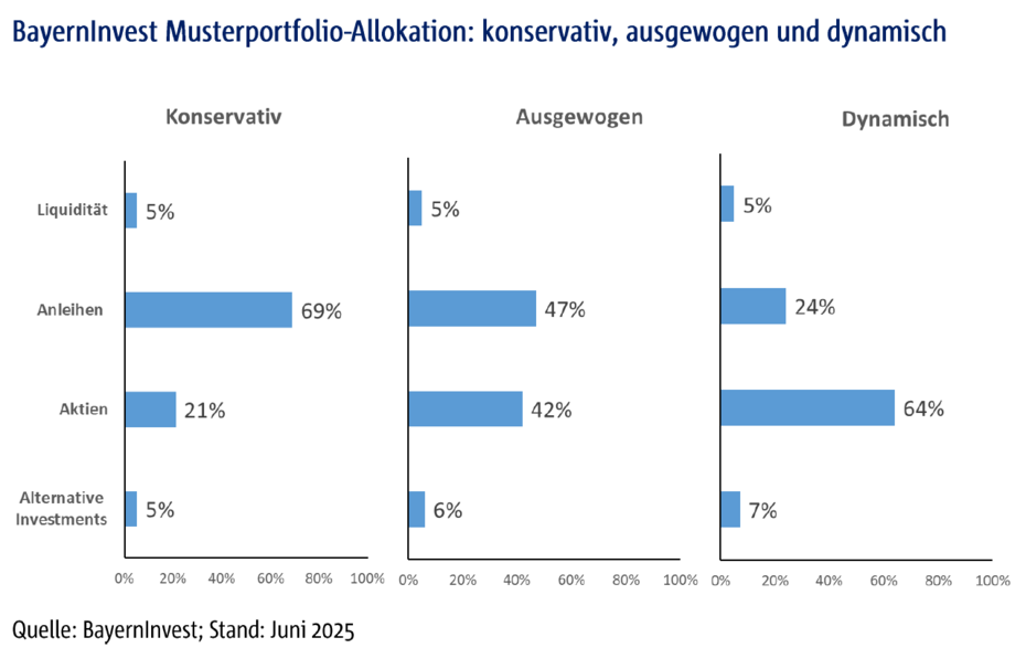 Veränderungen an den Kapitalmärkten fließen im BayernInvest-Investmentansatz kontinuierlich und situationsbezogen ein. Ziel ist eine stabile Rendite mit einem klaren Fokus auf nachhaltige und robuste Substanzanlagen. Im ersten Halbjahr haben wir das Portfoliorisiko in mehreren Schritten angepasst, um gezielt an Marktschwankungen zu partizipieren.