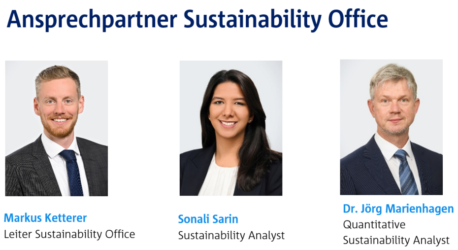 - Kundenberatung & -betreuung in allen ESG-relevanten Fragestellungen – von regulatorischen Anforderungen bis zur Portfolioausgestaltung