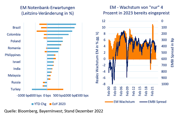 Zahlreiche EM-Zentralbanken haben Zinsanhebungszyklus (so gut wie) beendet. Auch hier warten 2023 Zinssenkungen. EMBI-Spreads dank USD- und Treasury-Trendwende attraktiv!